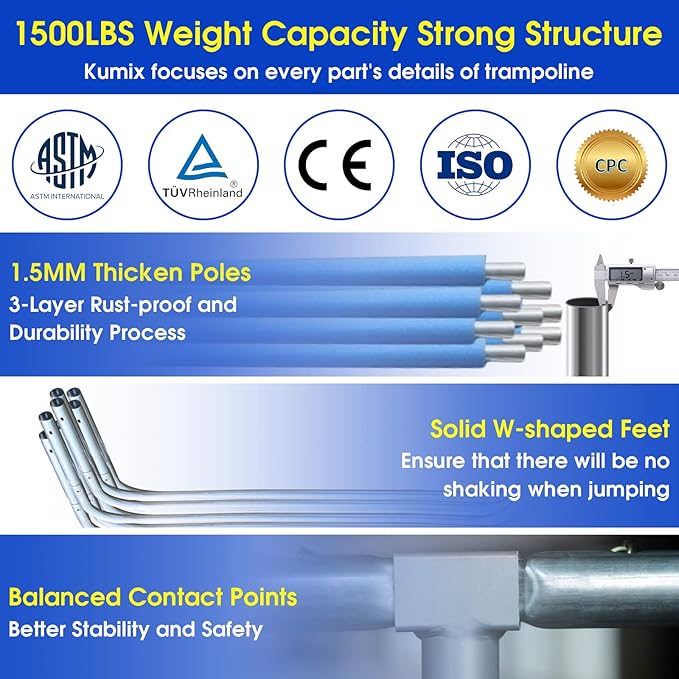 - 1500Lbs Max Weight Capacity: Kumix 15FT trampoline passed ASTM F381-16 Standard Safety Specification for Components, and CPC, Chemical Test. Due to the 12PCS heavy-duty galvanized steel frame, 6 U-legs, and 96pcs galvanized springs, the trampoline is sturdy and can hold a capacity of up to 6-7kids. Advise SINGLE person to weigh no more than 330LBS.