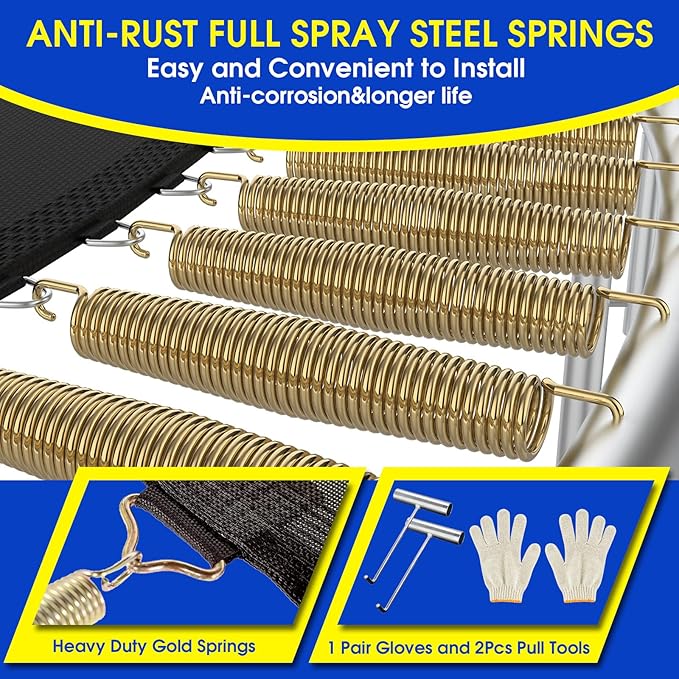- 👍Upgrade Waterproof Trampoline Material: Added waterproof and anti-UV safety poles foams which can protect the safety poles away being broken, and extend the lifetime of the trampoline. PP spring pad and high-strength woven jumping mat are also waterproof. Extra including 4 set trampoline wind stakes. Greatly reducing the risk of trampolines being broken in bad weather. Reducing your economic loss.