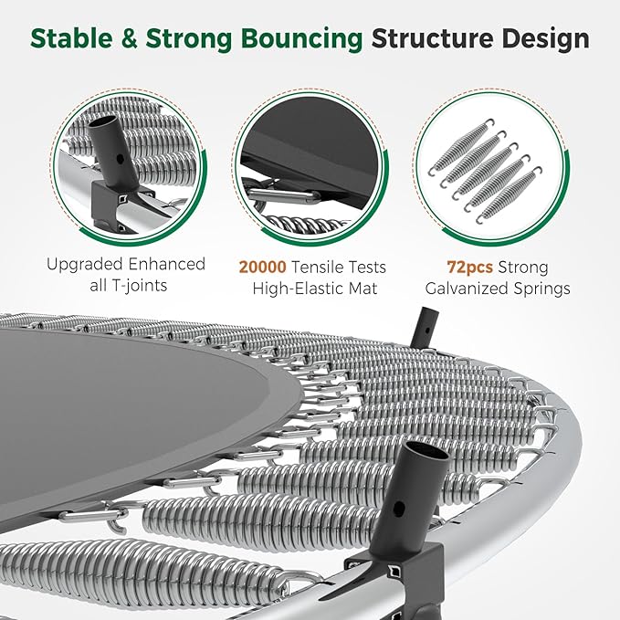 - 【Premium Bouncing Experience】This Tatub large trampoline is supported by 72 robust springs, guaranteeing stability with every bounce. Its heavy-gauge galvanized steel frame forms 4 W-shaped legs with bars, providing a solid foundation for the jumping zone